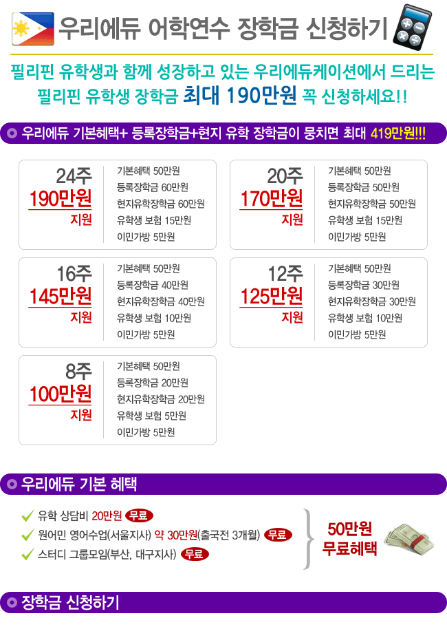 우리에듀 필리핀 어학연수 장학금 신청하세요!!